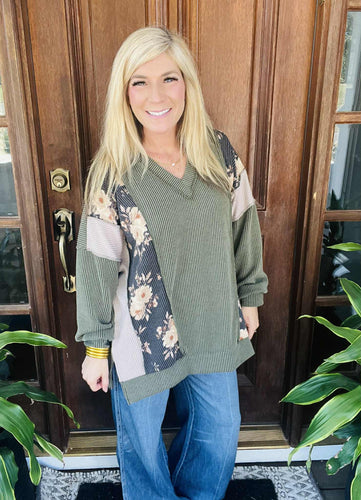 Oversized Olive/Floral Colorblock Raised Rib Long Sleeve Top